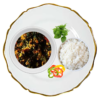 A zingy gourmet stew, built on a base of spinach, onions, and ginger sautéed in palm oil, made fiery with chilis; it is served with enchanting steamed white rice, and your choice of chicken, fish, turkey, and goat.